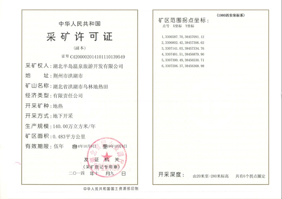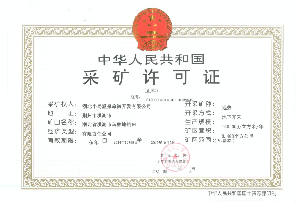 半島溫泉公司從2013年啟動采礦許可證的申報工作,在鄂旅投公司和洪湖地方政府的大力支持下,公司與相關(guān)部門專班推進,緊密協(xié)作,周密安排,圓滿完成了涉及審批的相關(guān)14個專項報告資料,為證書的取得奠定了基礎(chǔ)。